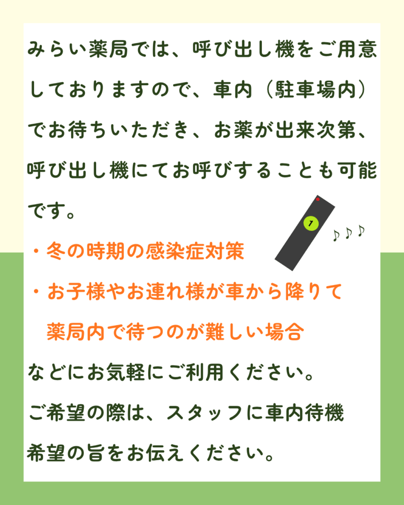 呼び出し機を導入しました 投稿公開日:2025年11月14日 投稿カテゴリー:一般 呼び出し機(ショッピングモールのフードコートなどで使われているアレです)を導入しましたので、お車でお越しの方は、お薬ができるまで車内(駐車場内)でもお待ち頂けます。※用事等を済ませてから再度お越し頂くことももちろん可能ですので、お時間を有効にご活用ください。 車内待機をご希望の方は、受付時にスタッフにお気軽にお声がけください。